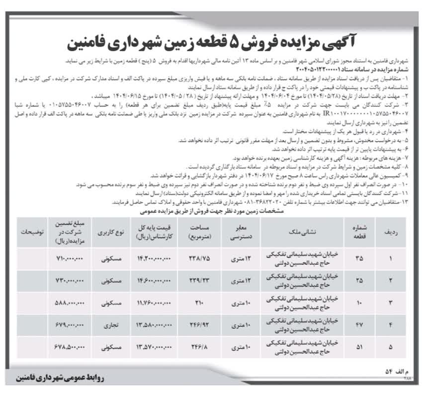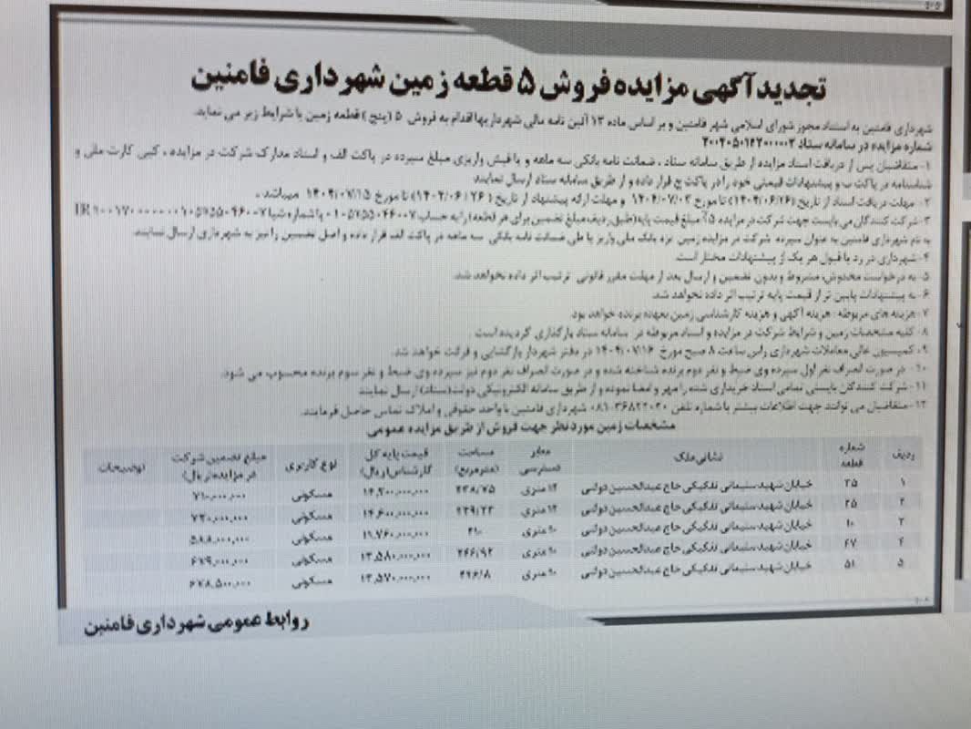 آگهی مزایده فروش 5 قطعه زمین شهرداری فامنین تاریخ 1404/06/26 | پرینت آگهی مزایده فروش 5 قطعه زمین شهرداری فامنین شهریور ماه 1404 بازگشت مطالب مرتبط: آگهی مزایده عمومی فروش اموال اسقاطی شهرداری فامنینآگهی مزایده فروش 5 قطعه زمین شهرداری فامنینآگهی تجدید مزایده فروش 5 قطعه زمین شهرداری فامنینتجدید آگهی مزایده فروش 3 قطعه زمین شهرداری فامنین 1402/12/14عملکرد مرداد ماه 98