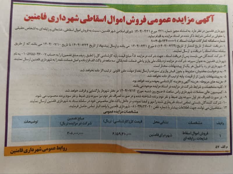 آگهی مزایده عمومی فروش اموال اسقاطی شهرداری فامنین شهریور ماه 1404