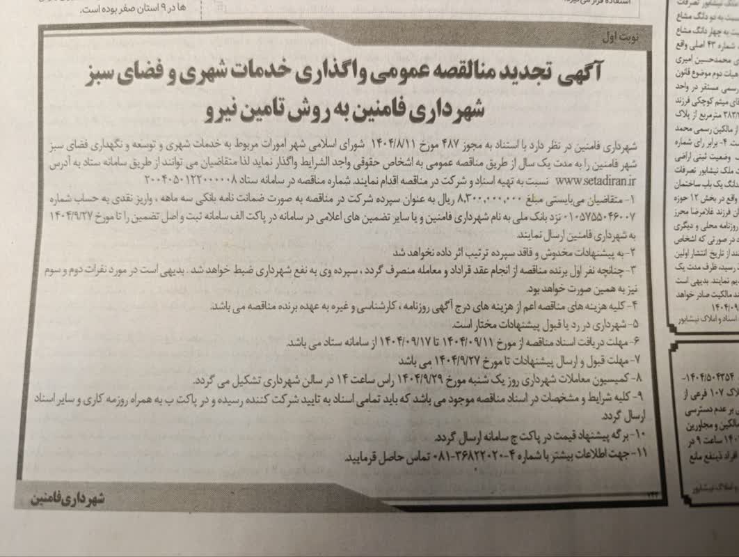 شهرداری فامنین در نظر دارد با استناد به مجوز 487 مورخ 11/8/1404 شورای اسلامی شهر امورات مربوط به خدمات شهری و توسعه و نگهداری فضای سبز شهر فامنین را به مدت یک سال از طریق مناقصه عمومی به اشخاص حقوقی واجد الشرایط واگذار نماید لذا متقاضیان می توانند از طریق سامانه ستاد به آدرس www.setadiran.ir نسبت به تهیه اسناد و شرکت در مناقصه اقدام نمایند. شماره مناقصه در سامانه ستاد 2004050122000008